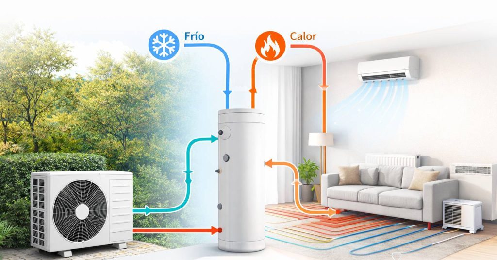 La aerotermia también utiliza una bomba de calor con válvula de inversión, pero su enfoque es distinto. La gran diferencia es que está diseñada para climatizar toda la vivienda y para trabajar principalmente con sistemas de distribución por agua. Este punto es clave: el agua es un medio excelente para transportar energía térmica, y por eso permite una distribución más uniforme y eficiente del calor o del frío.
